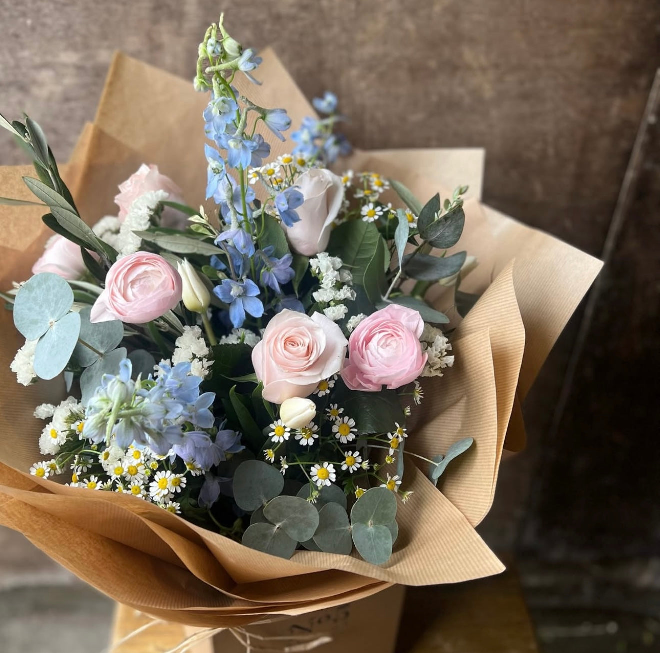 Bouquets come beautifully presented in a kraft gift bag and paper wrapped - making the most gorgeous and lasting impression. Photo shows a £40
